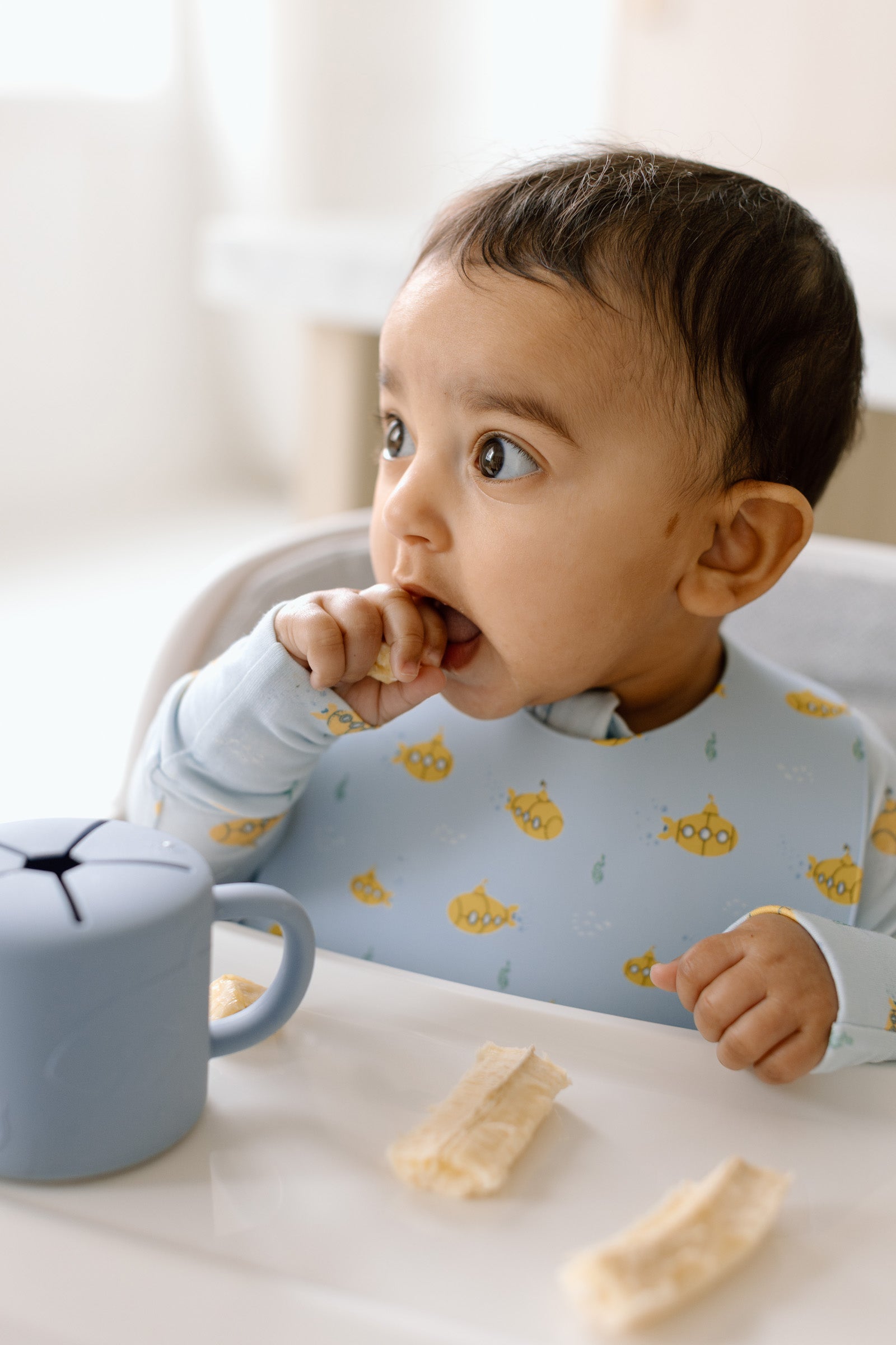 Our silicone bibs are buttery, soft, waterproof, and stain-resistant. It is easy to clean; simply wipe it down for a quick cleaning or put it in the top rack dishwasher for a deep clean. It features a wide catch-all pouch below a high chair tray – perfect for collecting food, crumbs, and spills. Reinforced buttonholes for a durable and adjustable fit for long-lasting wear, suitable for ages 3 - 36 months. This handy bib is available in various modern colours and fresh designs to make mealtime fun.