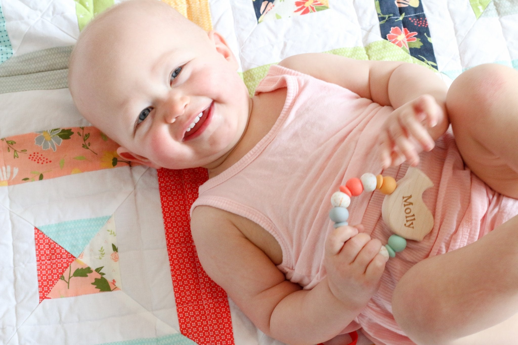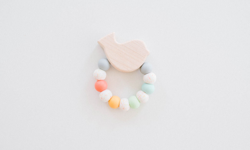 Our Bird Charm Baby Teether is the perfect teether for babes who are curious and want a teether with multiple textures. Add a name on the star for an extra personal touch! Unfortunately, we are only able to put a single word on this item. Toss the teether in the freezer to get cold for extra help soothing the gums.