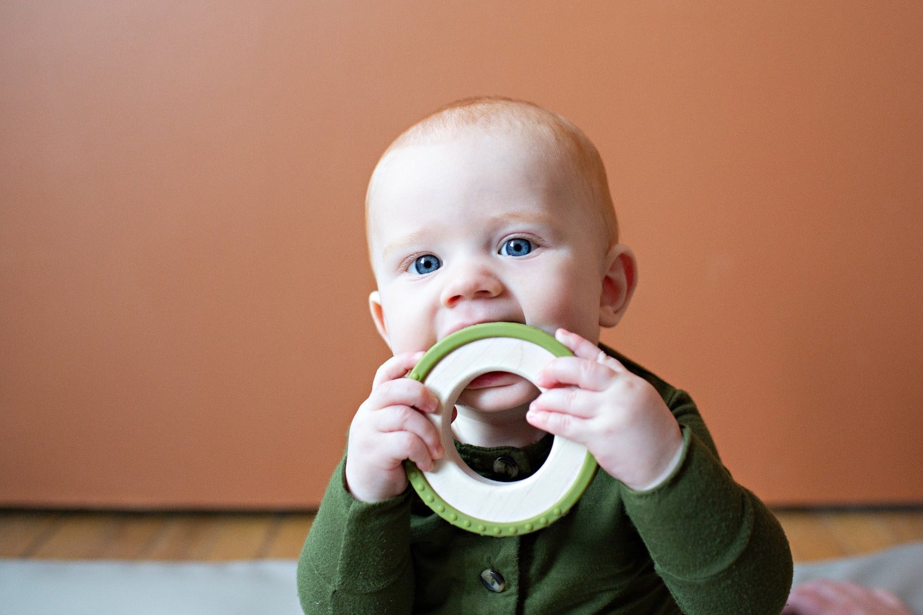 Teething isn't always fun, but it can sure be pretty with our silicone wrapped wooden teether! Our new textured silicone wrap fits snuggly around a hard maple wood teether ring and is interchangeable if you want to swap out the color. The entire toy can be tossed in the freezer for up to 1 hour, both the wood and the silicone will retain the coldness and be extra soothing on little gums. It's lightweight and easy to hold, working on all those gross motor skills that are so important early on!